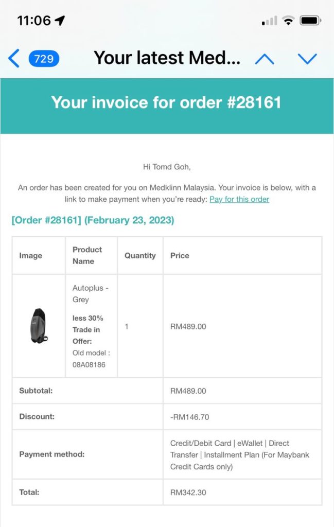 Bought the item at a discounted price which is a bargain. However, the online experience when purchasing the item during a promotion is quite a hassel. Fortunately, my email to medklinn was attended to promptly. However, unfortunately, after three weeks, my purchase was not executed until I wrote to medklinn.Then, within a few days I received the item.